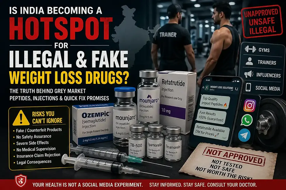 The rise of obesity and diabetes, and the increasing demand for rapid weight-loss drugs, have created a booming market for medicines like Ozempic (Semaglutide), Mounjaro (Tirzepatide), and emerging molecules such as Retatrutide. Alongside this demand, a troubling parallel market is also growing in India—illegal, unapproved, unethical, and counterfeit weight-loss drugs and peptides.